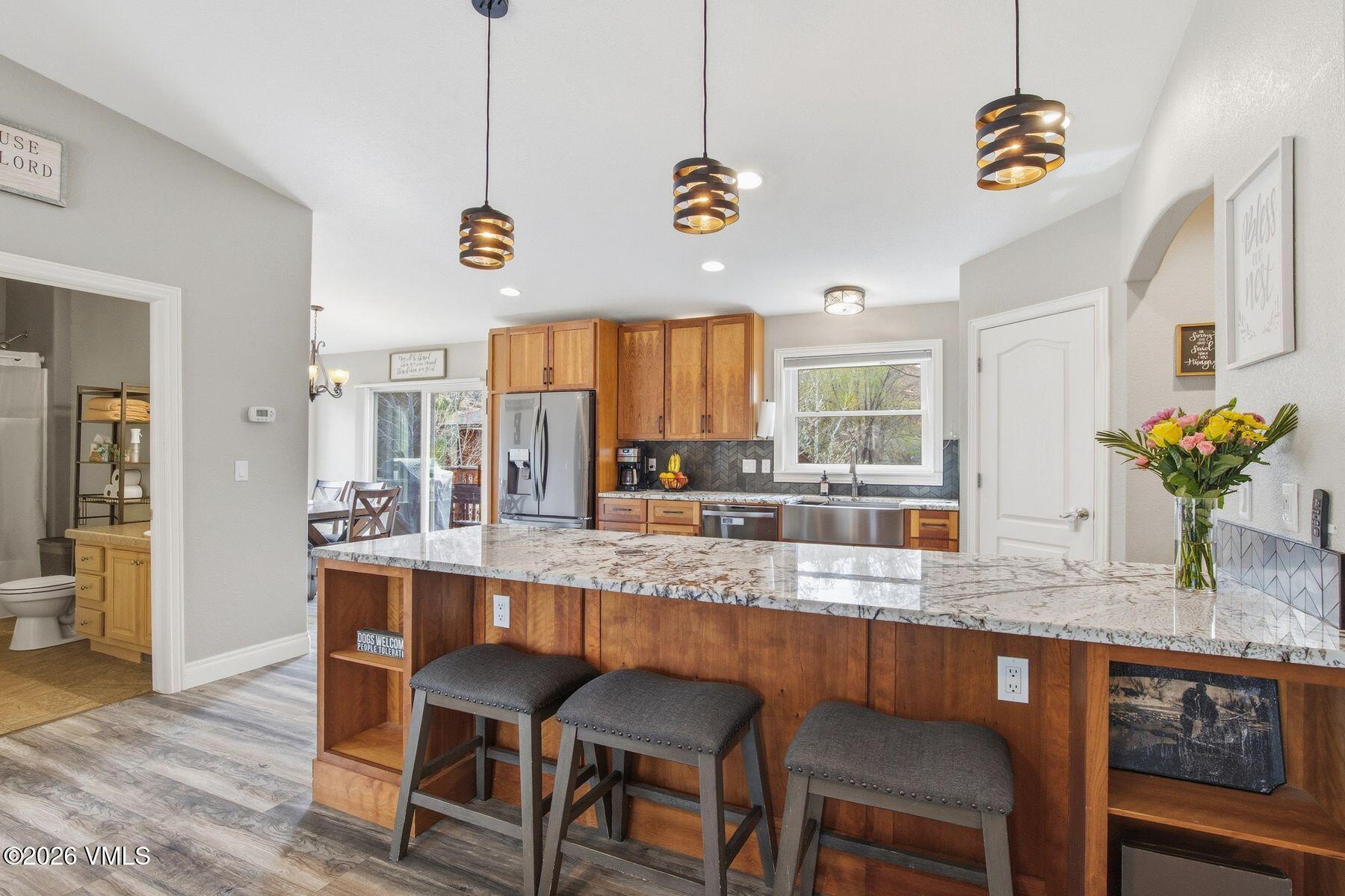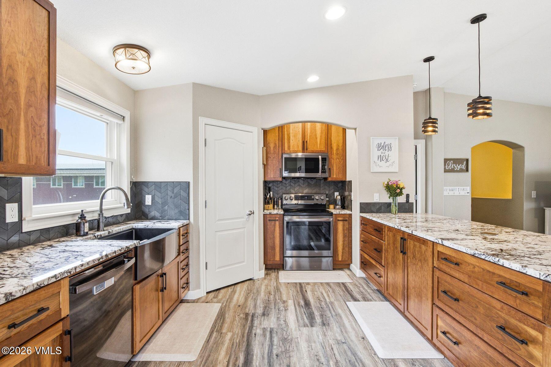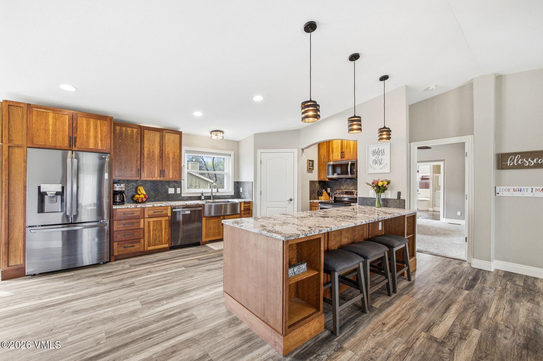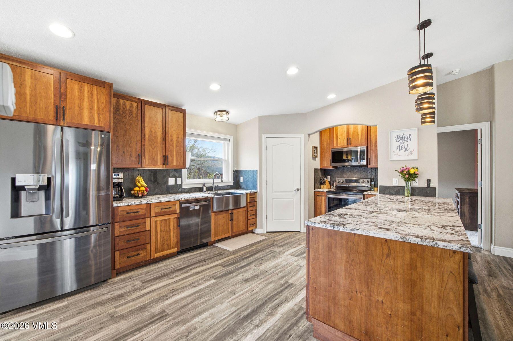 The main-level primary suite creates a true retreat, complete with a jetted soaking tub, walk-in closet, double sinks, and private water closet. A secondary main-floor bedroom offers ideal flexibility for family, guests, or a home office. The great room is anchored by an inviting, open-concept kitchen with slab granite countertops, custom cherry cabinetry, an complete LG suite of Energy Star stainless steel appliances, and a generous walk-in pantry.