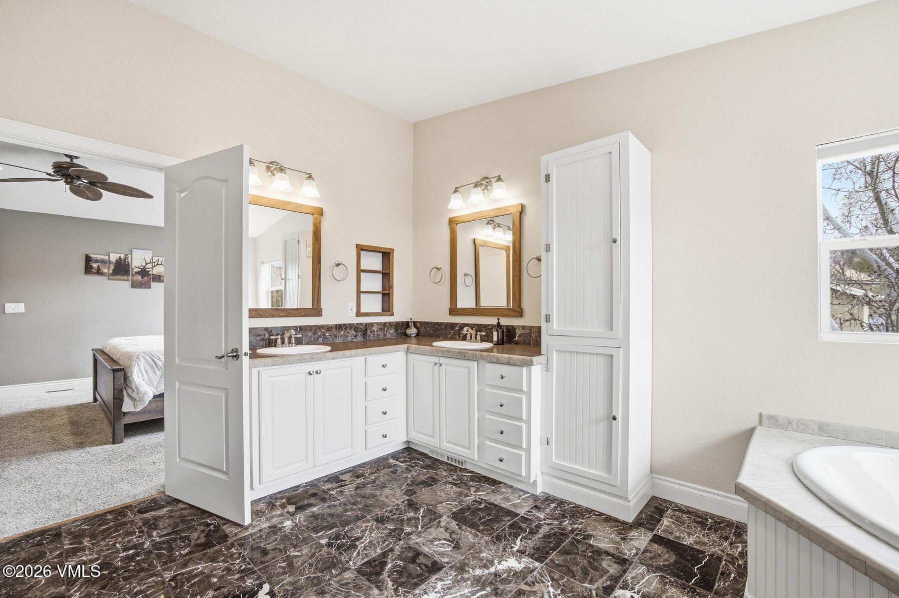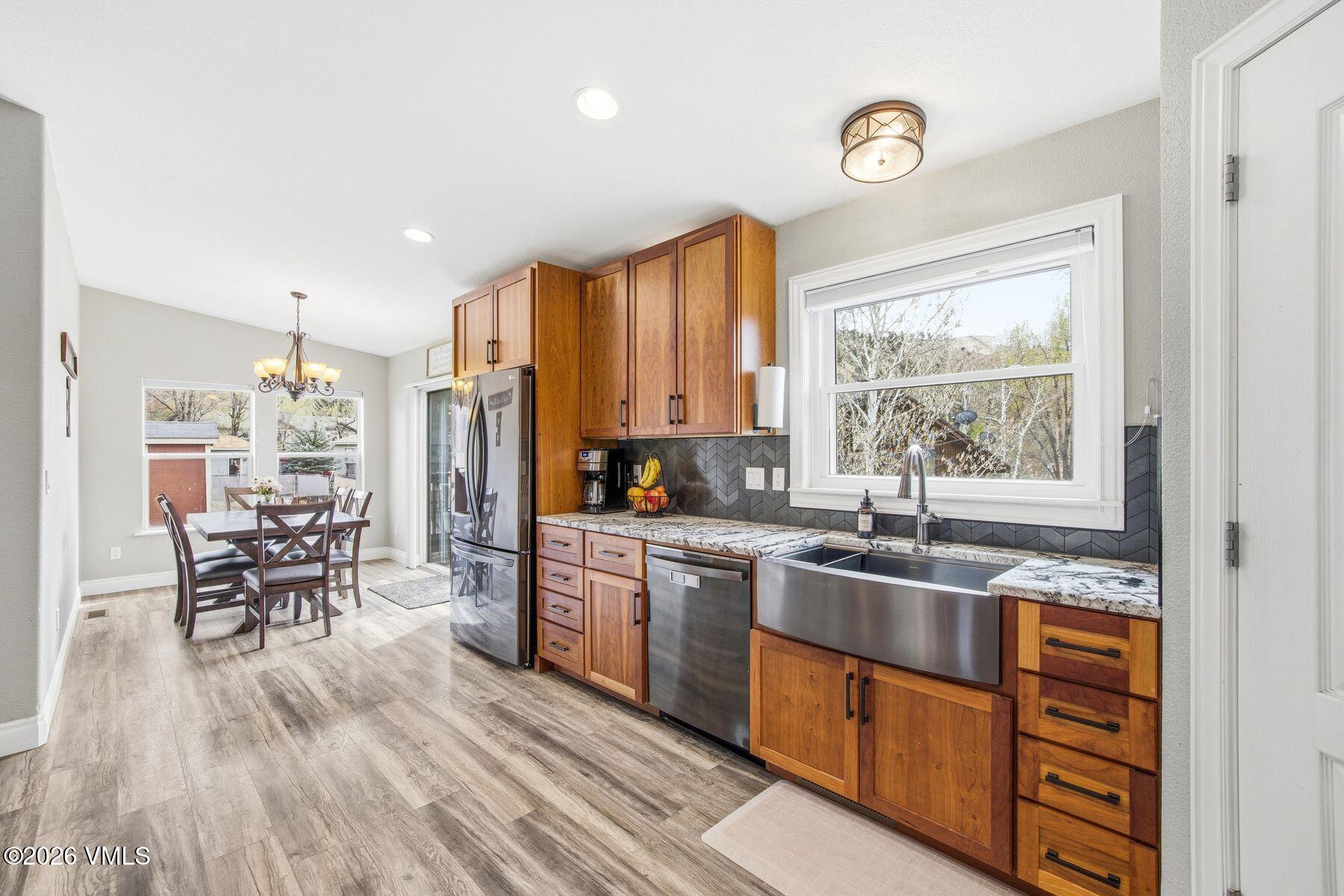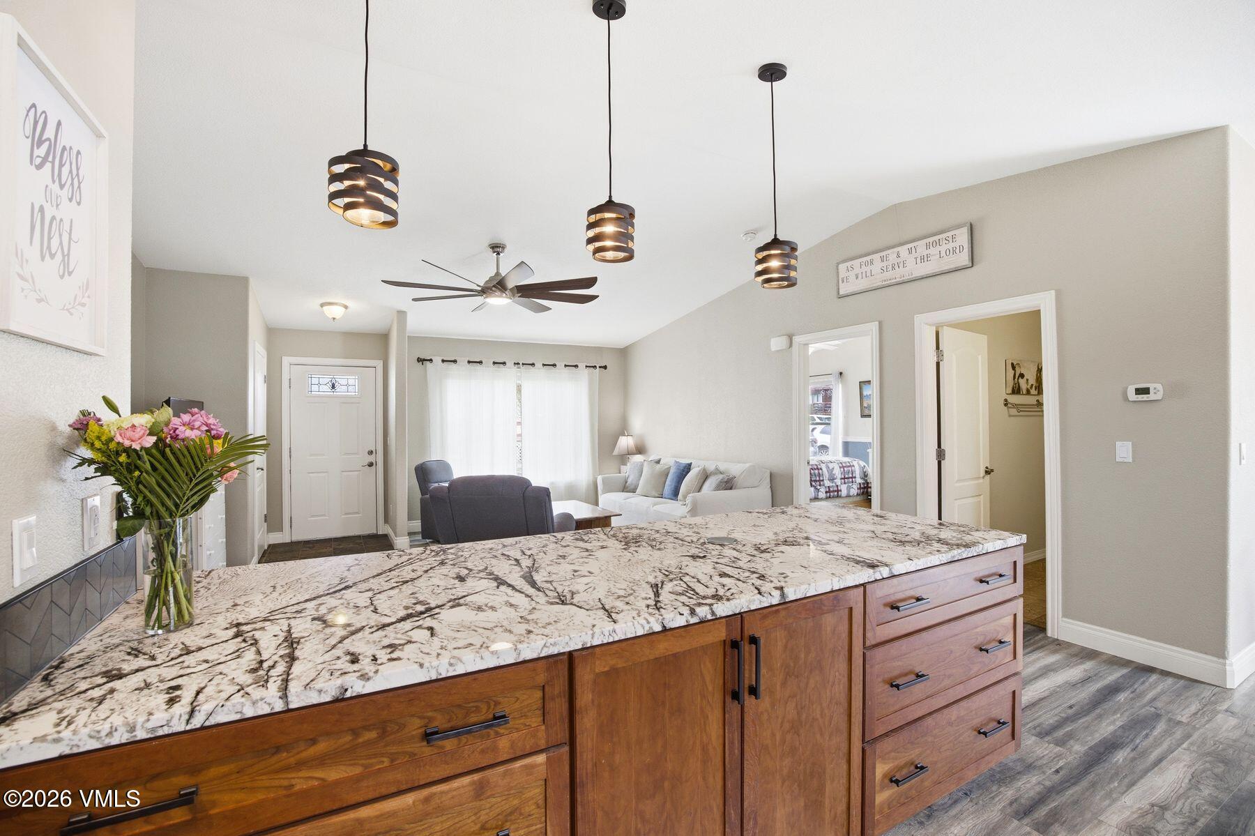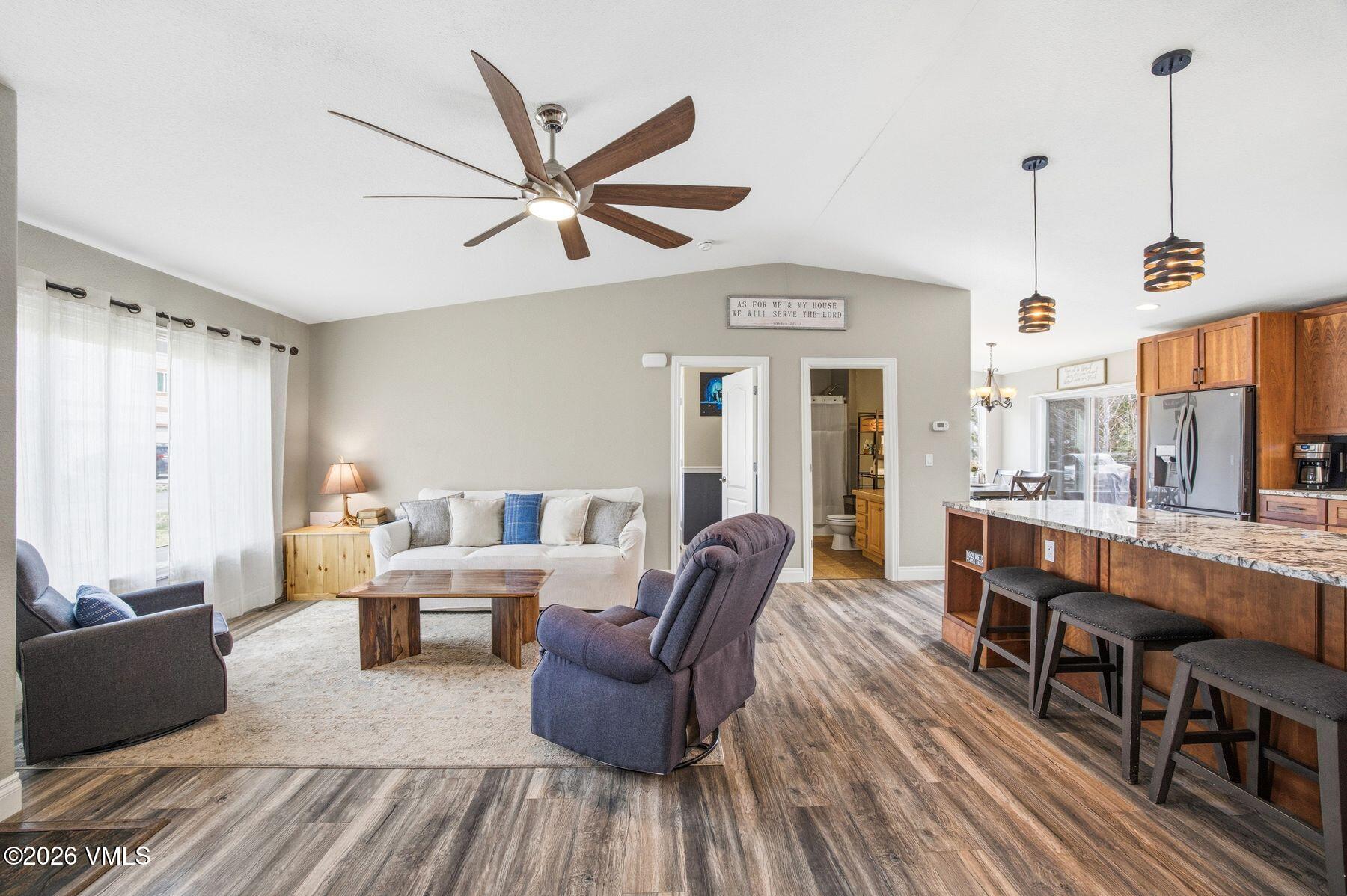 The main-level primary suite creates a true retreat, complete with a jetted soaking tub, walk-in closet, double sinks, and private water closet. A secondary main-floor bedroom offers ideal flexibility for family, guests, or a home office. The great room is anchored by an inviting, open-concept kitchen with slab granite countertops, custom cherry cabinetry, an complete LG suite of Energy Star stainless steel appliances, and a generous walk-in pantry.