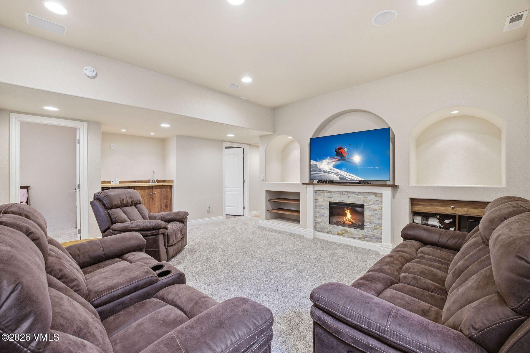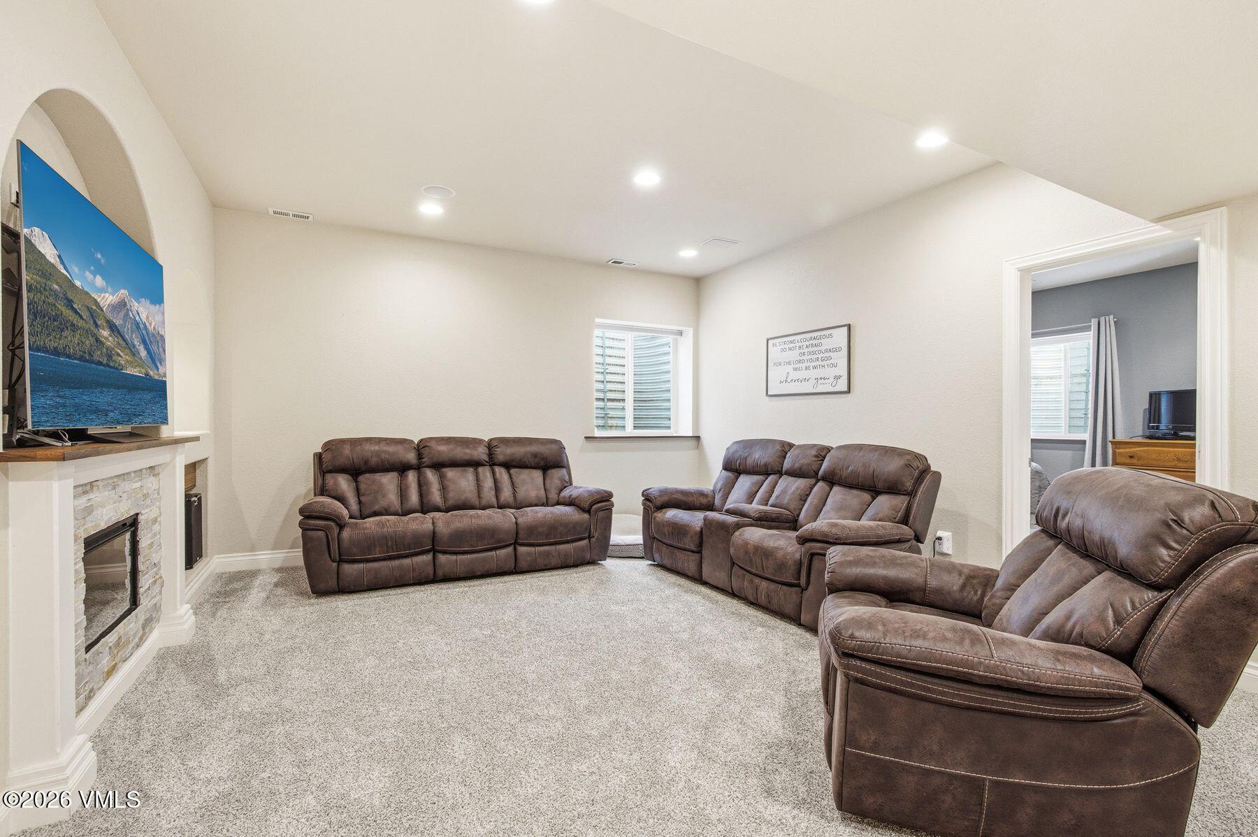 The lower level is designed for entertaining with a recreation room enhanced by surround sound, perfect for movie nights or gatherings. Recent improvements include a new roof, new carpet in 2024 and a garage heater for year-round convenience.